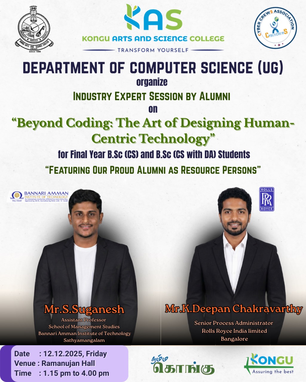12.12.2025 - Department of Computer Science Organize Industry Expert Session by Alumni on "Beyond Coding: The Art of Designing Human-Centric Technology" Read More ... |