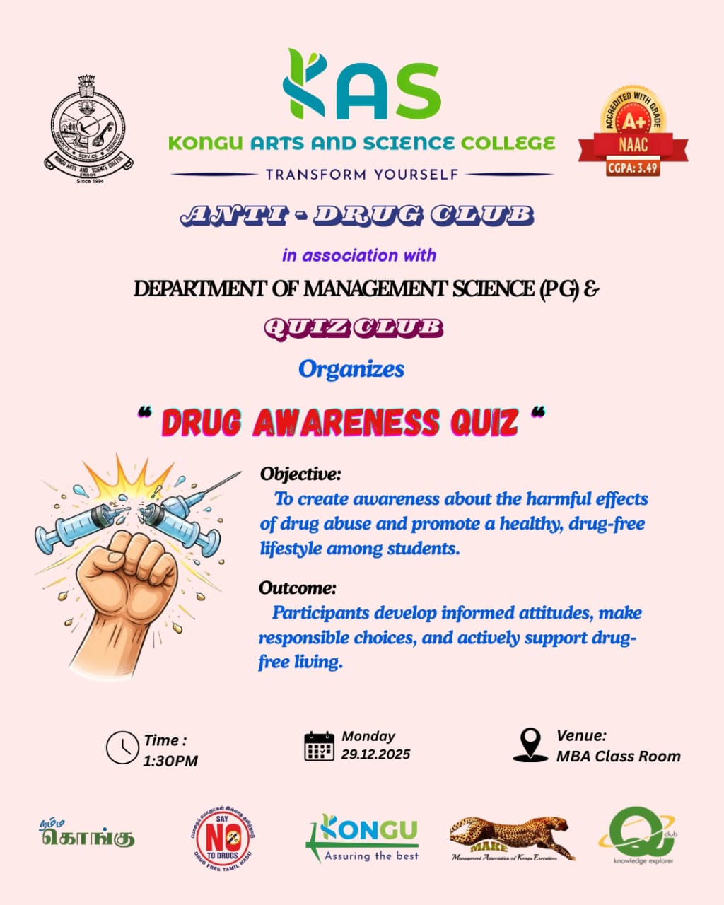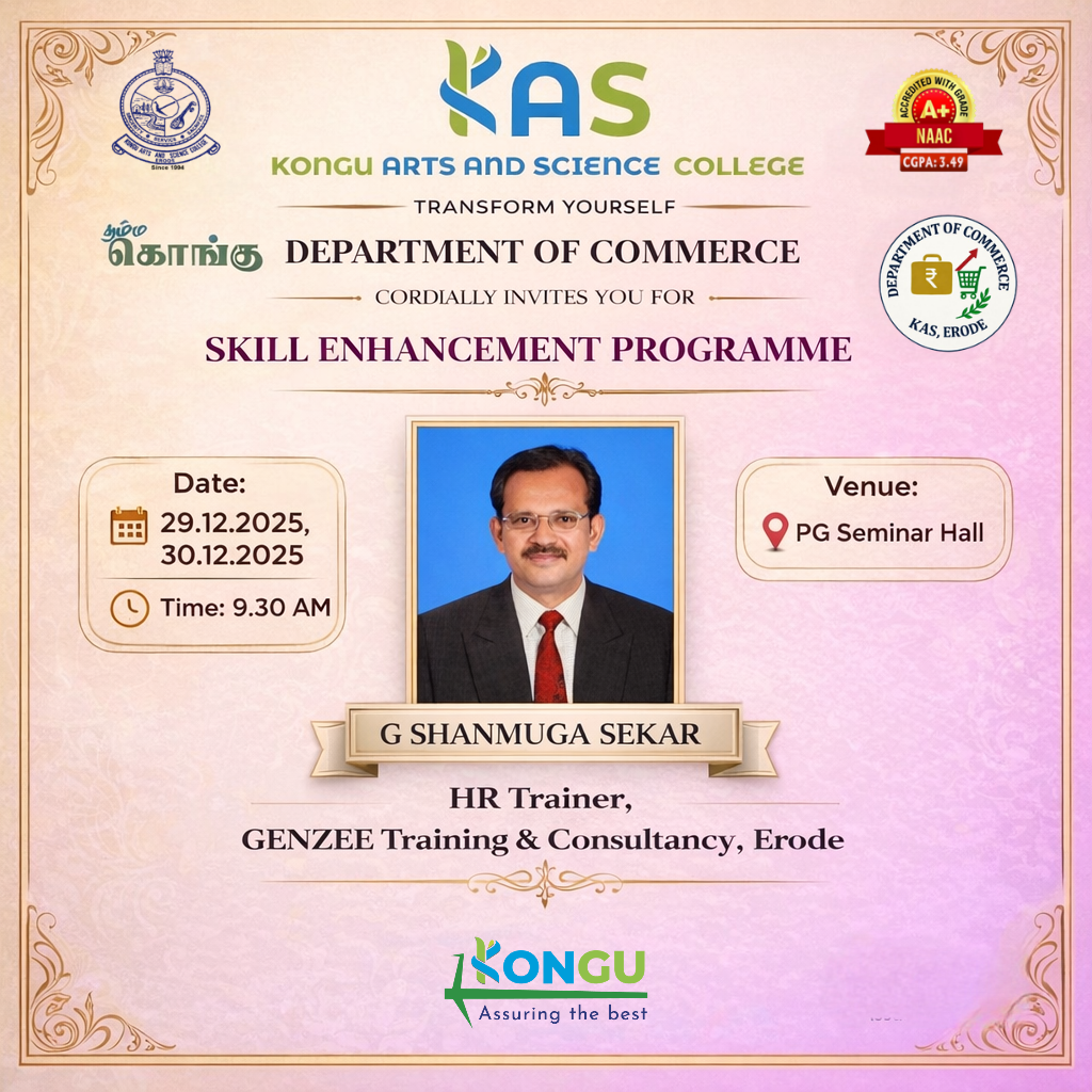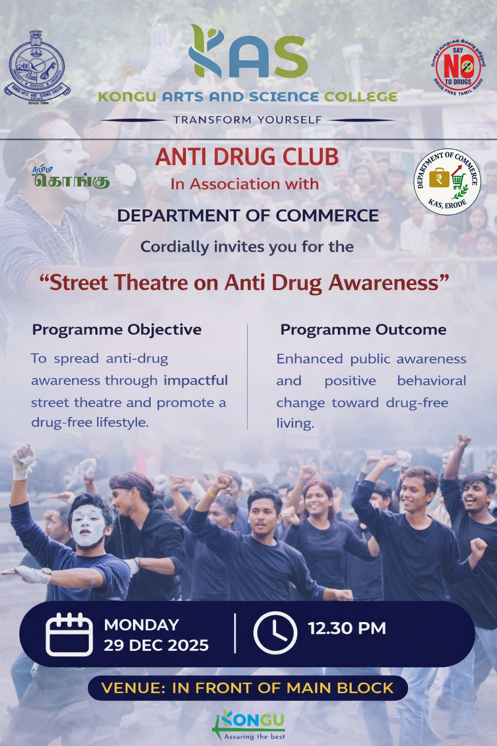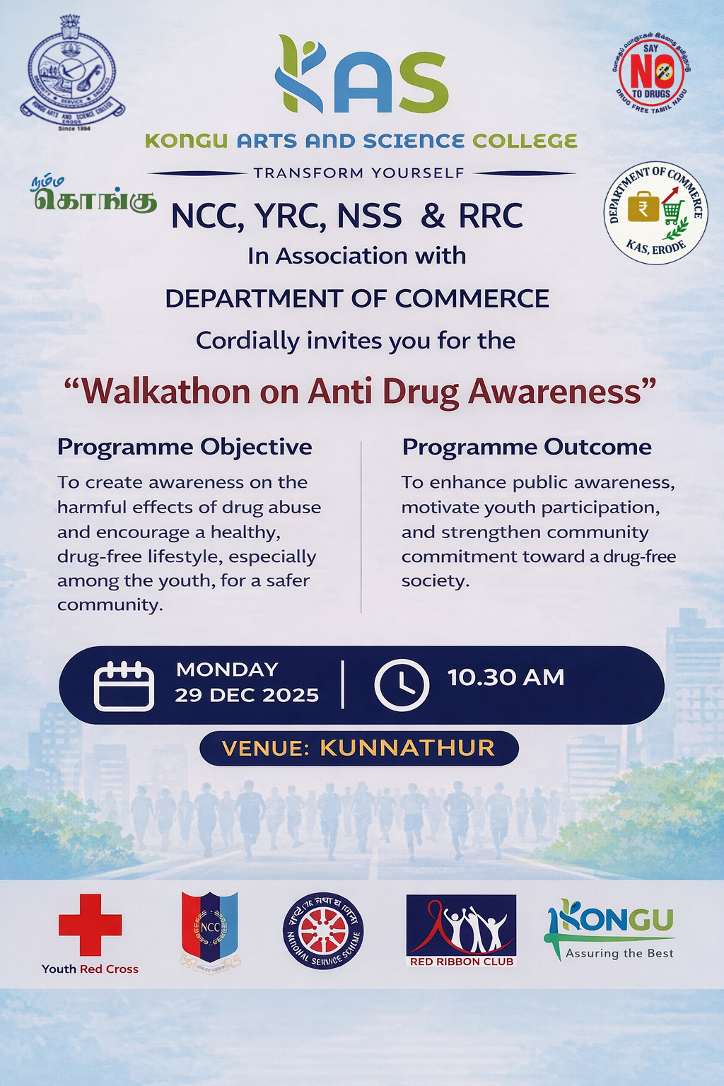 Kongu Arts and Science College is a leading co-educational institution in Erode, offering a variety of programmes in Arts and Science stream. It is affiliated to Bharathiar University, and run by The Kongu Vellalar Institute of Technology Trust, Perundurai.