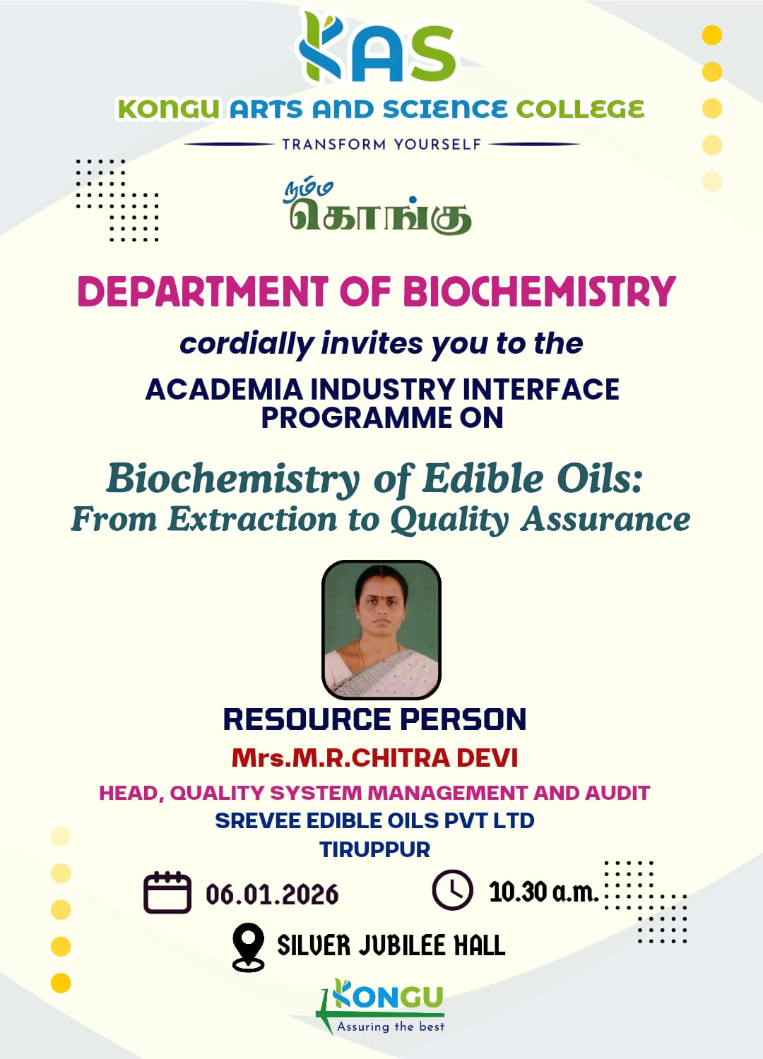 06.01.2026 Department of Biochemistry Organizes Academia Industry Interface Programme on "Biochemistry of Eligible Oils: From Extraction to Quality Assurance" Read More ... |